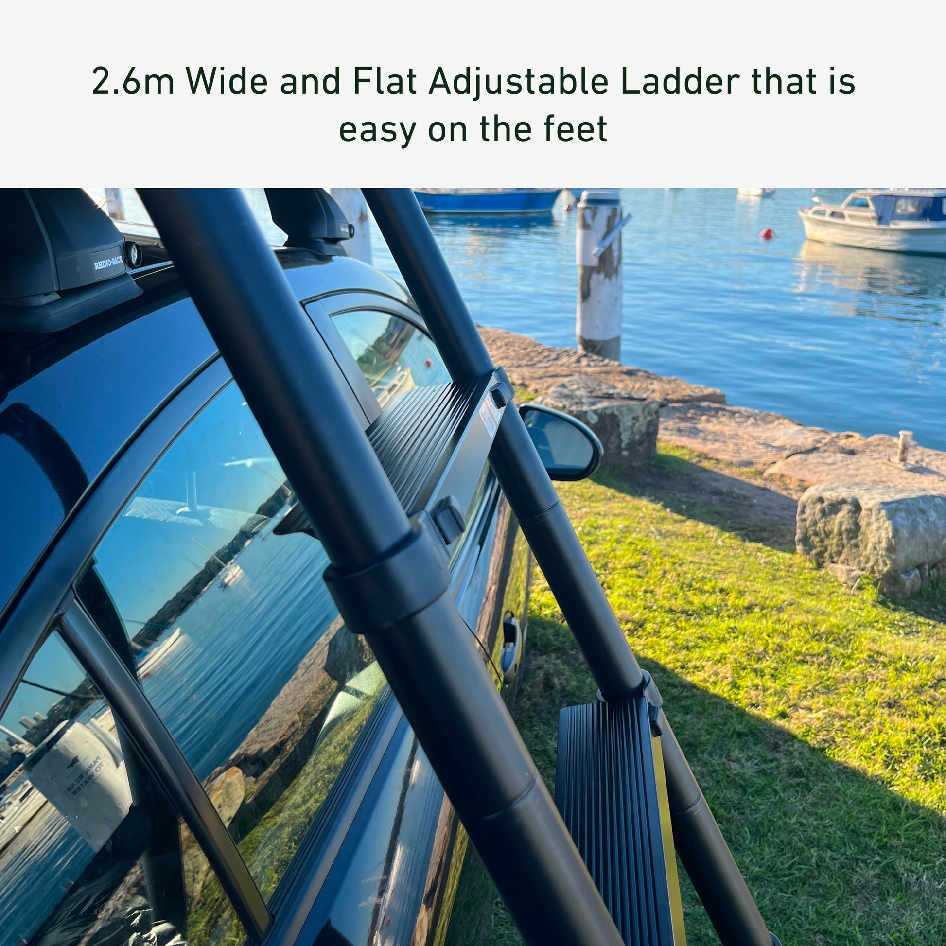- 2.6m Wide and Flat Adjustable Ladder: Designed for larger vehicles and trailers and comfortable on the feet.