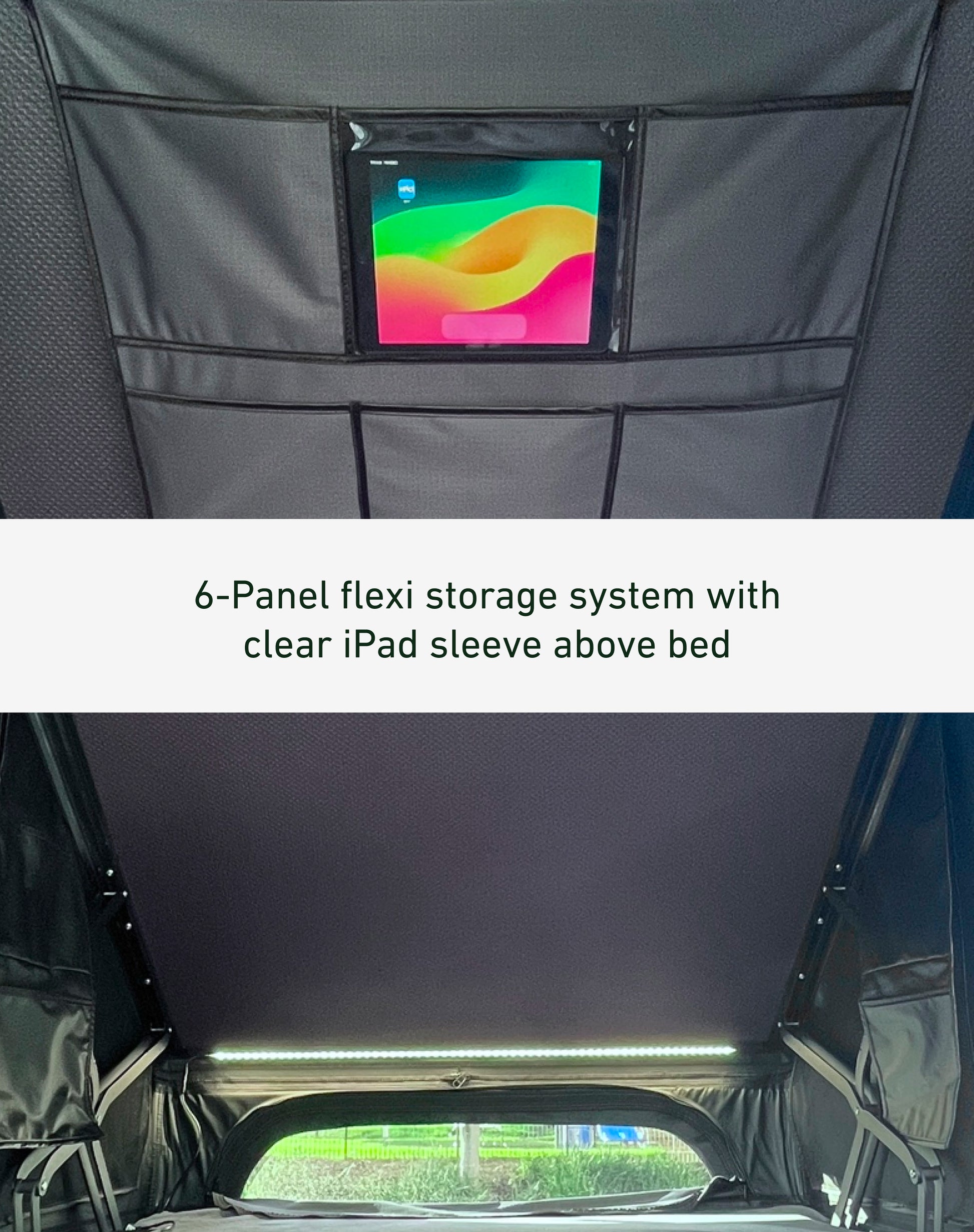 - 6-Panel Flexi Storage System: Keeps your gear organised, off the mattress, and within easy reach.